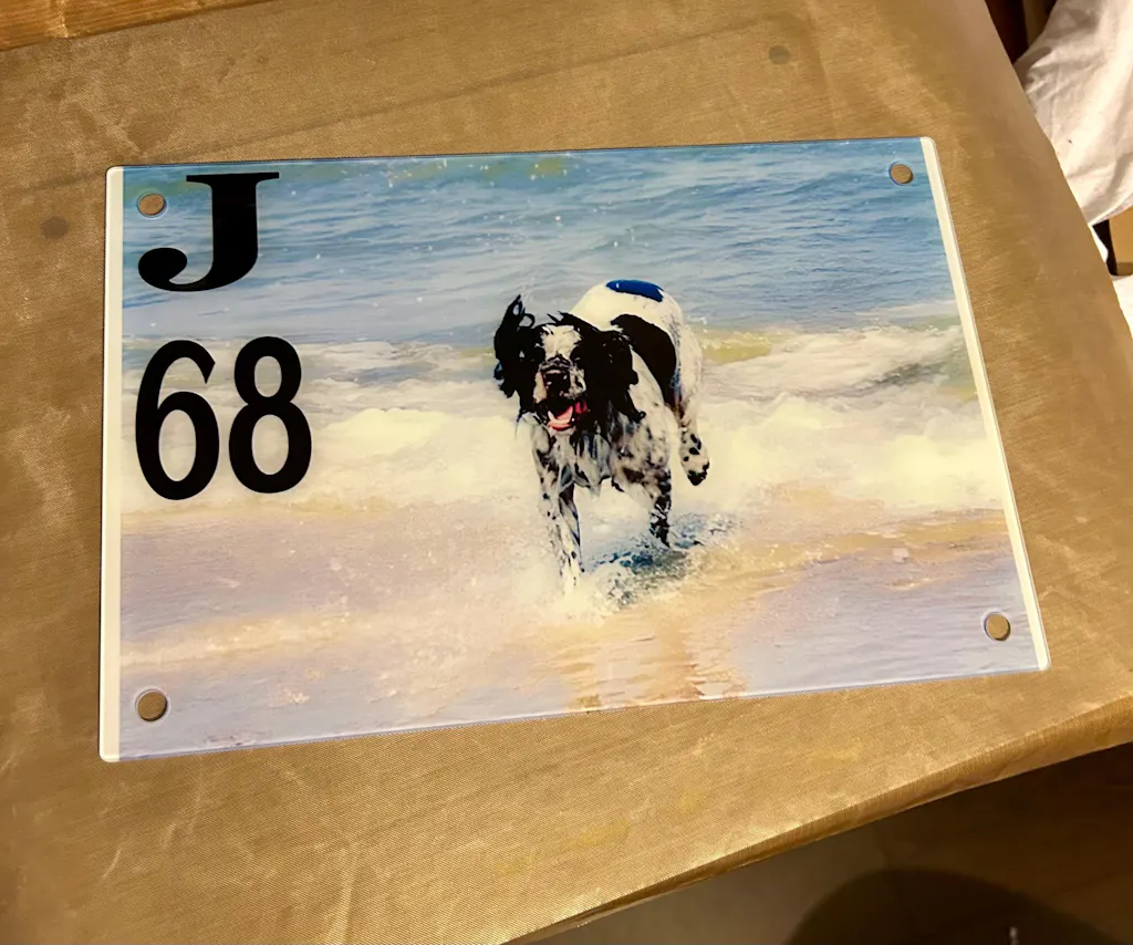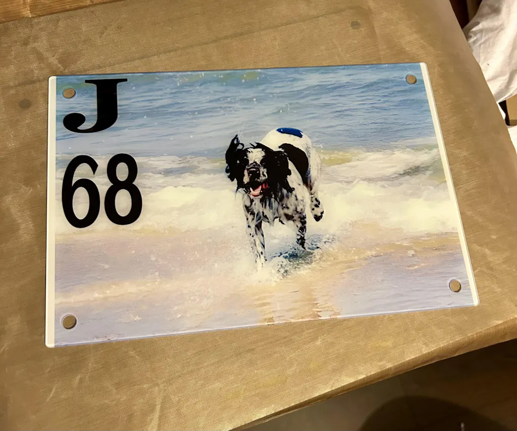 - Fotos in lebendigen Farben und kräftiger schwarzer Text harmonieren sehr gut mit dem Glasmaterial