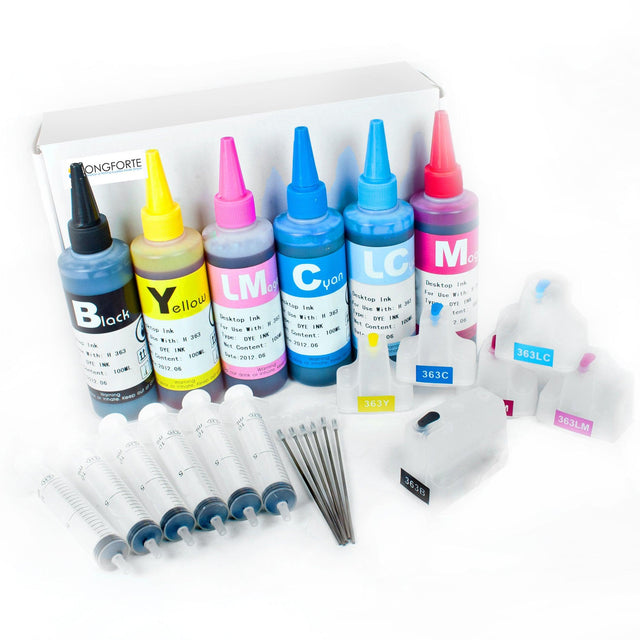 Simply use the syringes provided to refill the cartridges once they have been used. Each cartridge contains a memory chip that autoresets when the cartridge is filled so the HP printer reads the cartridge as being full.