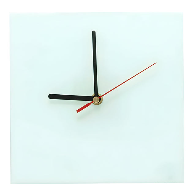 Make a bold statement with this 30cm square sublimation glass wall clock—ideal for larger spaces or standout personalised gifts. The smooth, clear glass face reveals your printed design from behind, producing a sleek and professional finish. With a generous surface area, it's perfect for full-sized artwork, logos, or family photos. Each clock comes with hands, a movement mechanism, and arrives individually boxed.
