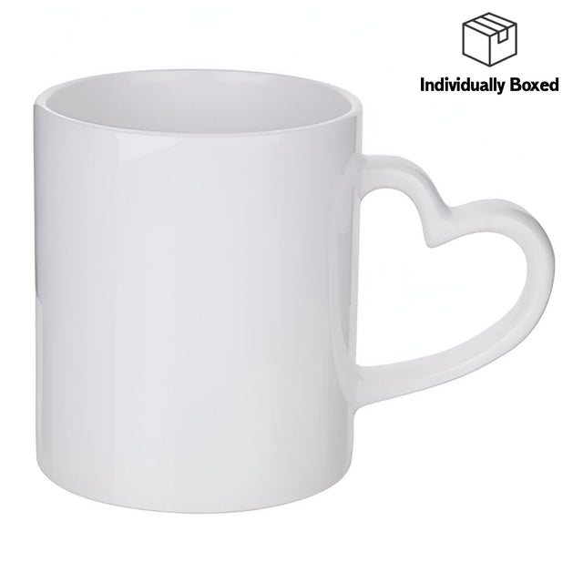 The heart-shaped handle adds a distinctive decorative touch, making this mug especially suitable for romantic designs, Valentine’s gifts, wedding keepsakes, and personalised photo mugs. It is compatible with standard 11oz mug presses, allowing it to be printed using existing sublimation setups.