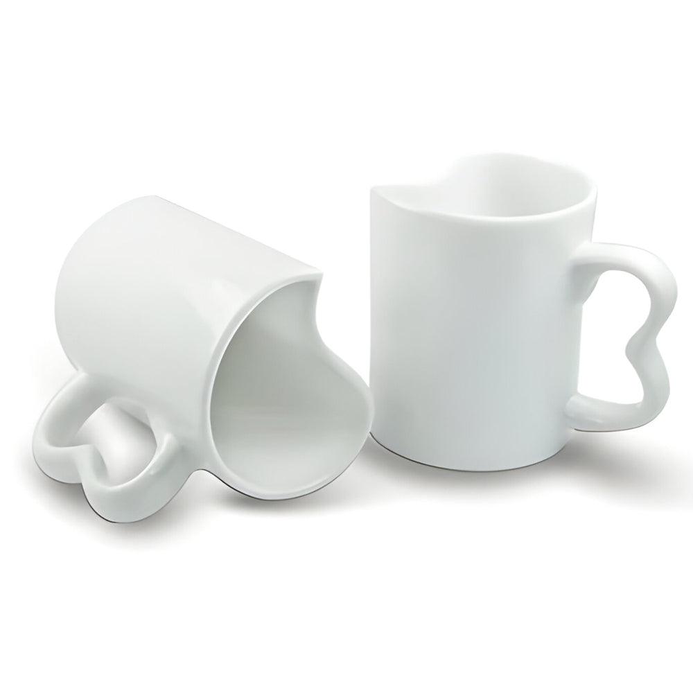 Very eye-catching set of two white sublimation mugs which have been created to fit together. Great for creating any designs for couples - a His and Hers set or a wedding anniversary set for instance.