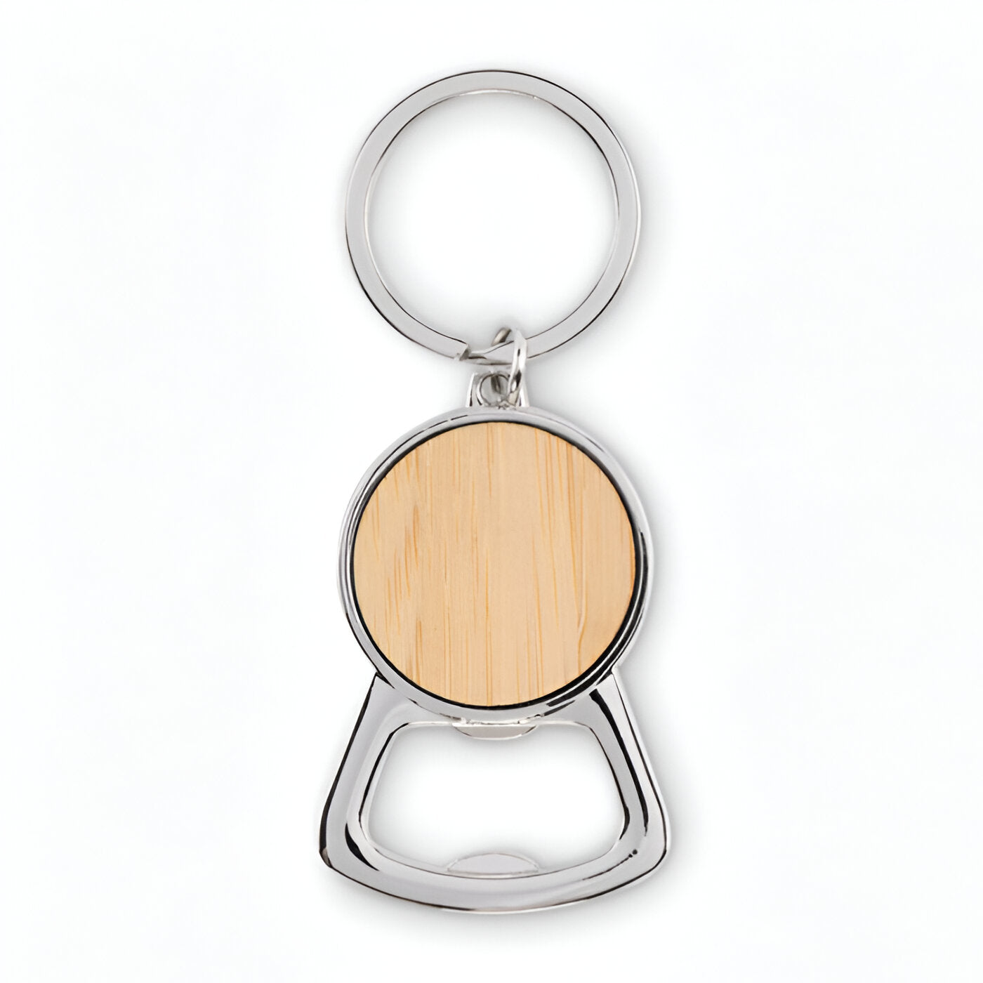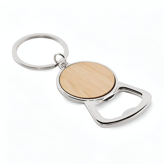 Stylish, sustainable, and functional, this recycled metal and bamboo bottle opener keyring is perfect for eco-conscious brands and gift-ready collections.