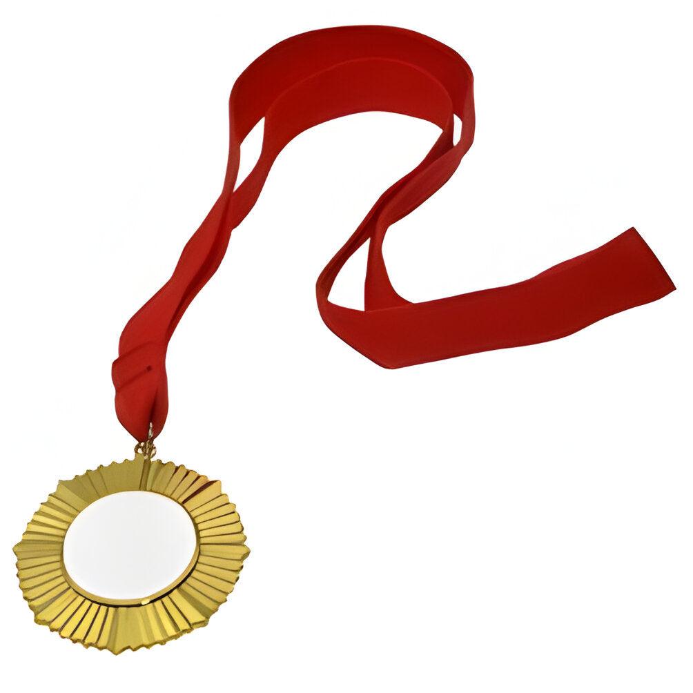 Celebrate achievements in style with our gold ornate sublimation medal, designed with a premium decorative border and supplied with a vibrant red ribbon for wearing around the neck.