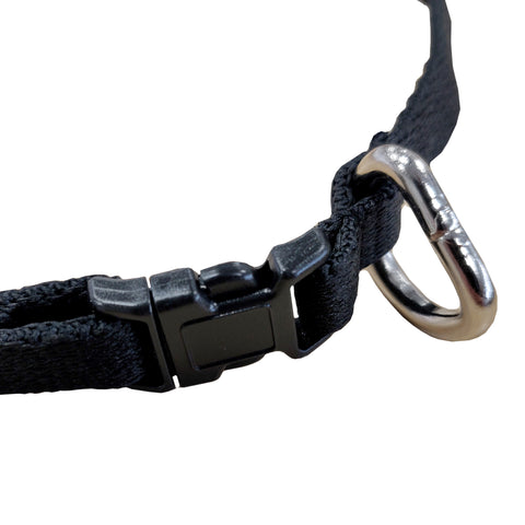 The adjustable black polyester neck strap is both durable and comfortable, featuring a secure buckle and clip for easy fastening. A built-in metal loop on the back allows a lead to clip directly onto the bandana, making it a functional as well as fashionable choice. Also available in Medium and Large sizes.