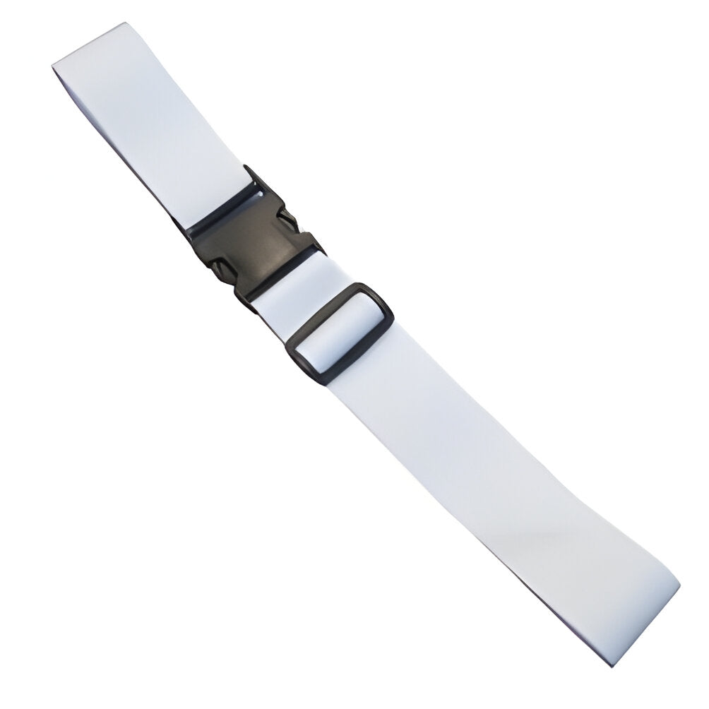 Design standout travel accessories with this plain white sublimation luggage strap, made from durable 100% polyester for bold, full-colour prints. Fully adjustable up to 170cm in circumference and 5cm wide, it offers a generous print area for names, graphics, or branding. Features a sturdy plastic buckle and fastening clip for secure, functional use on suitcases or travel bags.